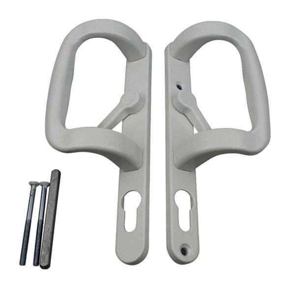 Fully reversible white sliding patio door handles with keyholes to suit any handed door. This is a common handle found on Pemberton and other makes of static caravan fitted with the XL lock.